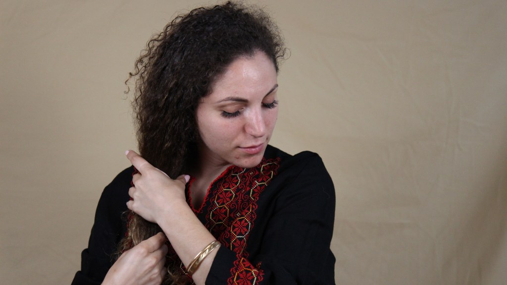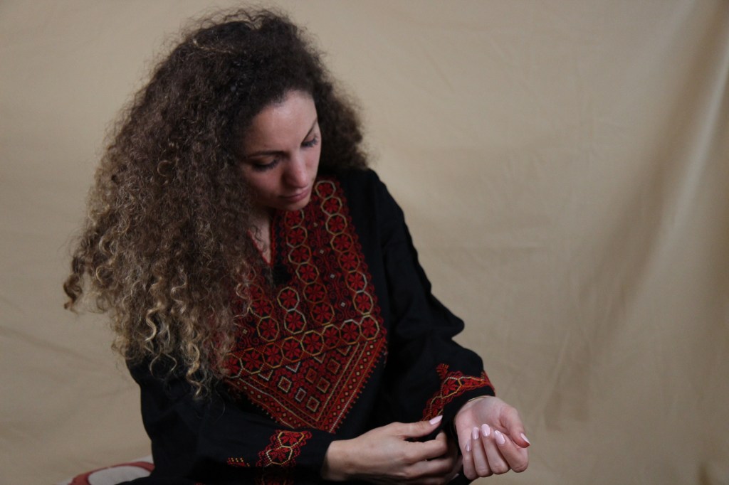 “This throbe is specific to Ramallah. It’s actually where my family is from in Palestine. The colors are very specific to Ramallah and the West Bank areas. This is the traditional Palestinian wear — you would wear this everyday if you wanted to or you could wear this to church or weddings and special occasions too.”